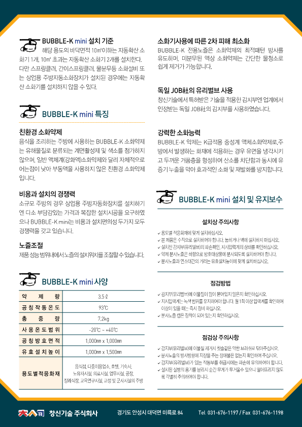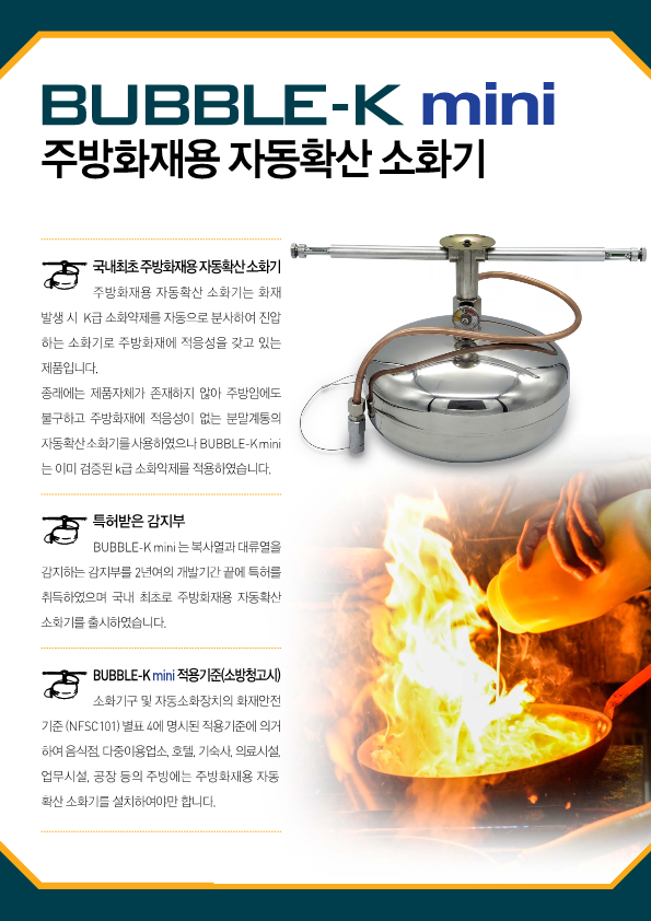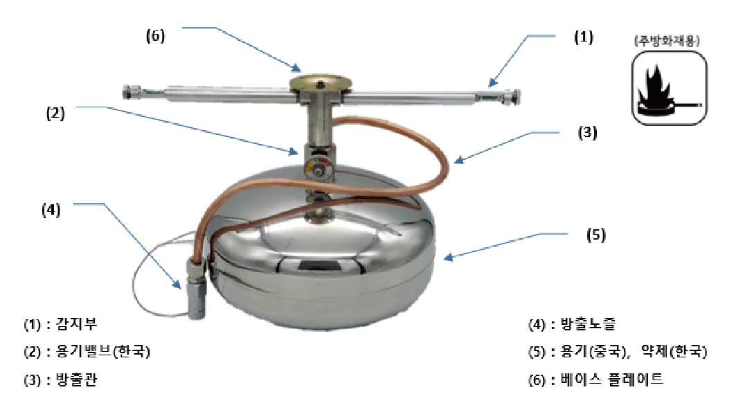 주방화재용 자동확산 소화기는 화재 발생 시 K급 소화약제를 자동으로 분사하여 진압 하는 소화기로 주방화재에 적응성을 갖고 있는 제품입니다